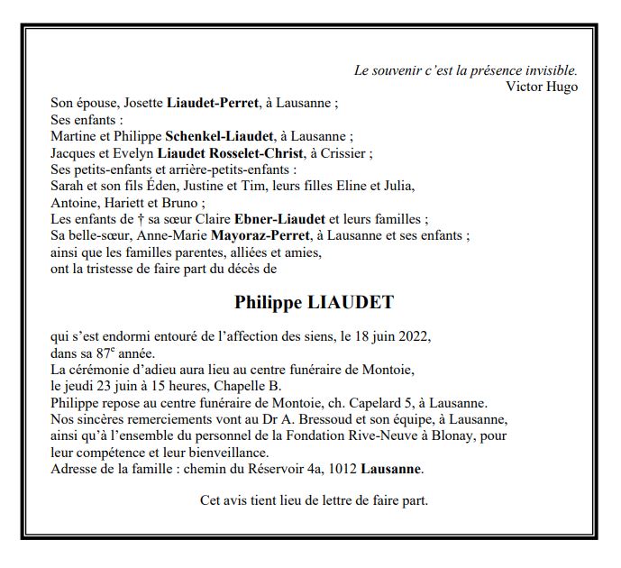 Philippe LIAUDET 01 aoû. 1935 - 18 juin. 2022 Avis mortuaire PFG Télecharger PDF Partager sur: Galerie PreviousNext PreviousNext
