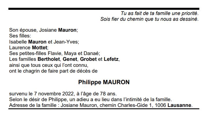 Philippe MAURON 22 oct. 1944 - 07 nov. 2022 Avis mortuaire PFG Télecharger PDF Partager sur: Galerie PreviousNext PreviousNext