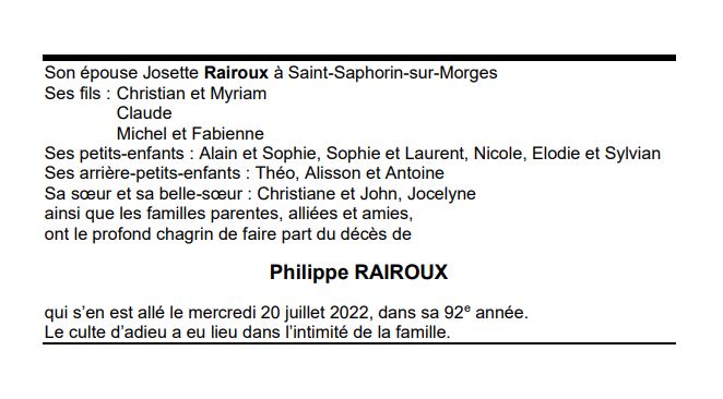 Philippe RAIROUX 16 avr. 1931 - 20 juil. 2022 Avis mortuaire PFG Télecharger PDF Partager sur: Galerie PreviousNext PreviousNext