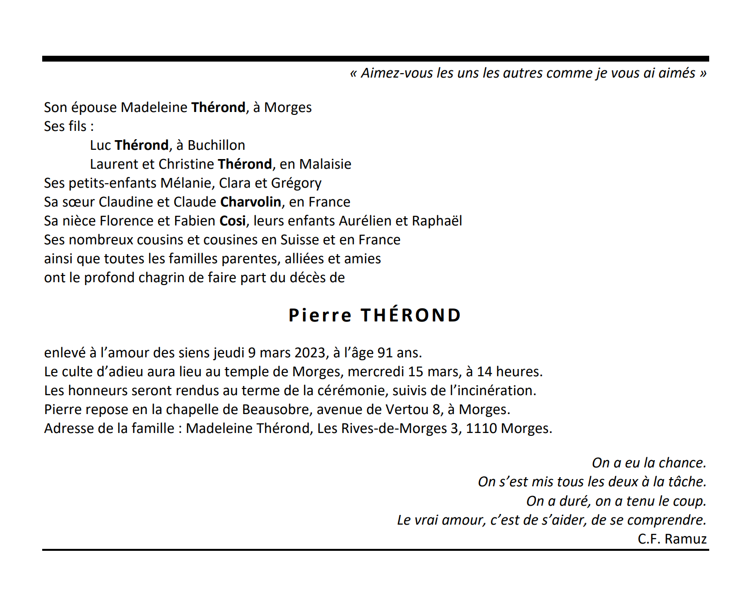 Pierre THÉROND 23 nov. 1921 - 09 mar. 2023 Avis mortuaire PFG Télecharger PDF Partager sur: Galerie PreviousNext PreviousNext