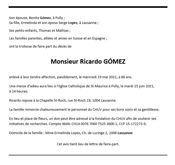 Ricardo GOMÉZ 29 jan. 1935 - 19 mai. 2021 Avis mortuaire PFG Télecharger PDF Partager sur: Galerie PreviousNext PreviousNext