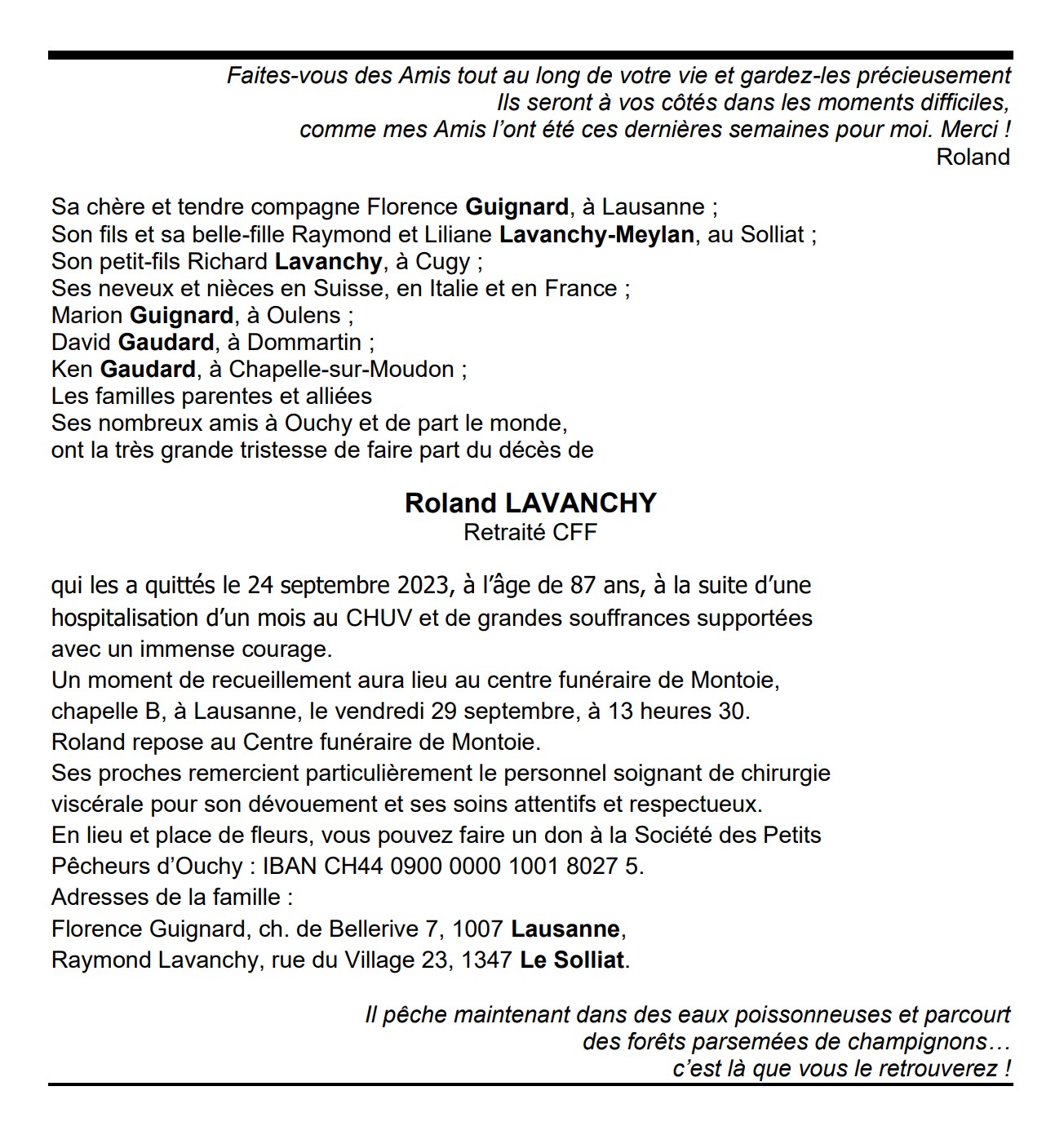Roland LAVANCHY 13 oct. 1936 - 24 sep. 2023 Avis mortuaire PFG Télecharger PDF Partager sur: Galerie PreviousNext PreviousNext