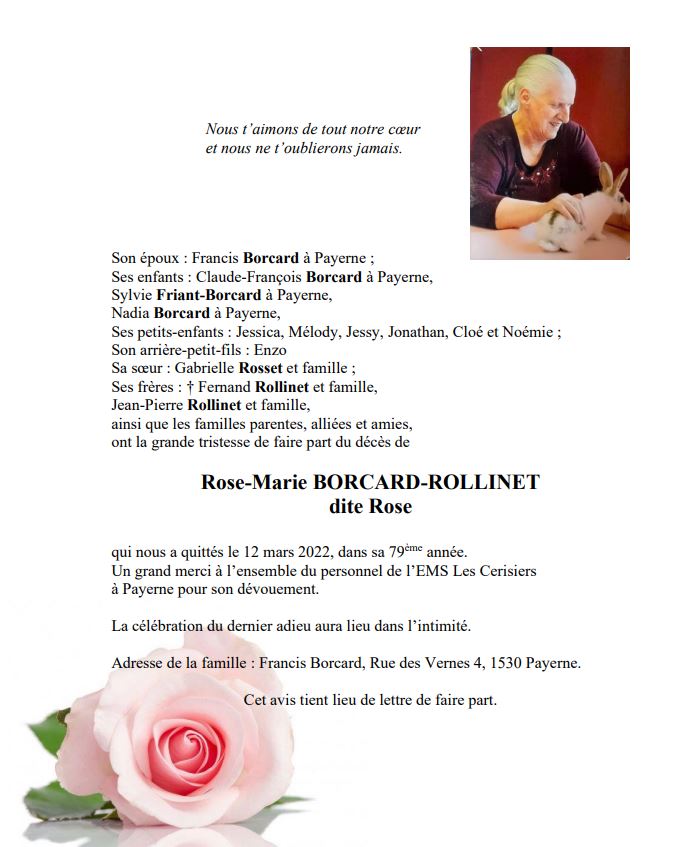 Rose-Marie BORCARD-ROLLINET dite Rose 02 juil. 1943 - 12 mar. 2022 Avis mortuaire PFG Télecharger PDF Partager sur: Galerie PreviousNext PreviousNext