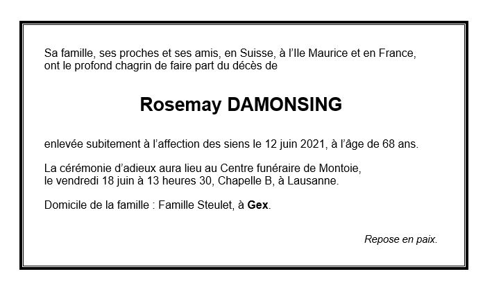 Rosemay DAMONSING 18 fév. 1953 - 12 juin. 2021 Avis mortuaire PFG Télecharger PDF Partager sur: Galerie PreviousNext PreviousNext