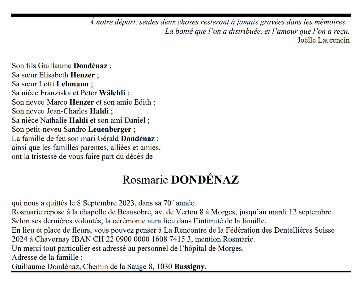 Rosmarie DONDÉNAZ 06 déc. 1953 - 08 sep. 2023 Avis mortuaire PFG Télecharger PDF Partager sur: Galerie PreviousNext PreviousNext
