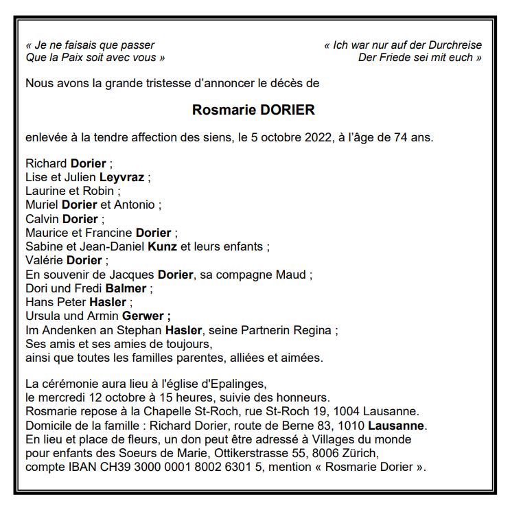 Rosmarie DORIER 16 aoû. 1948 - 05 oct. 2022 Avis mortuaire PFG Télecharger PDF Partager sur: Galerie PreviousNext PreviousNext