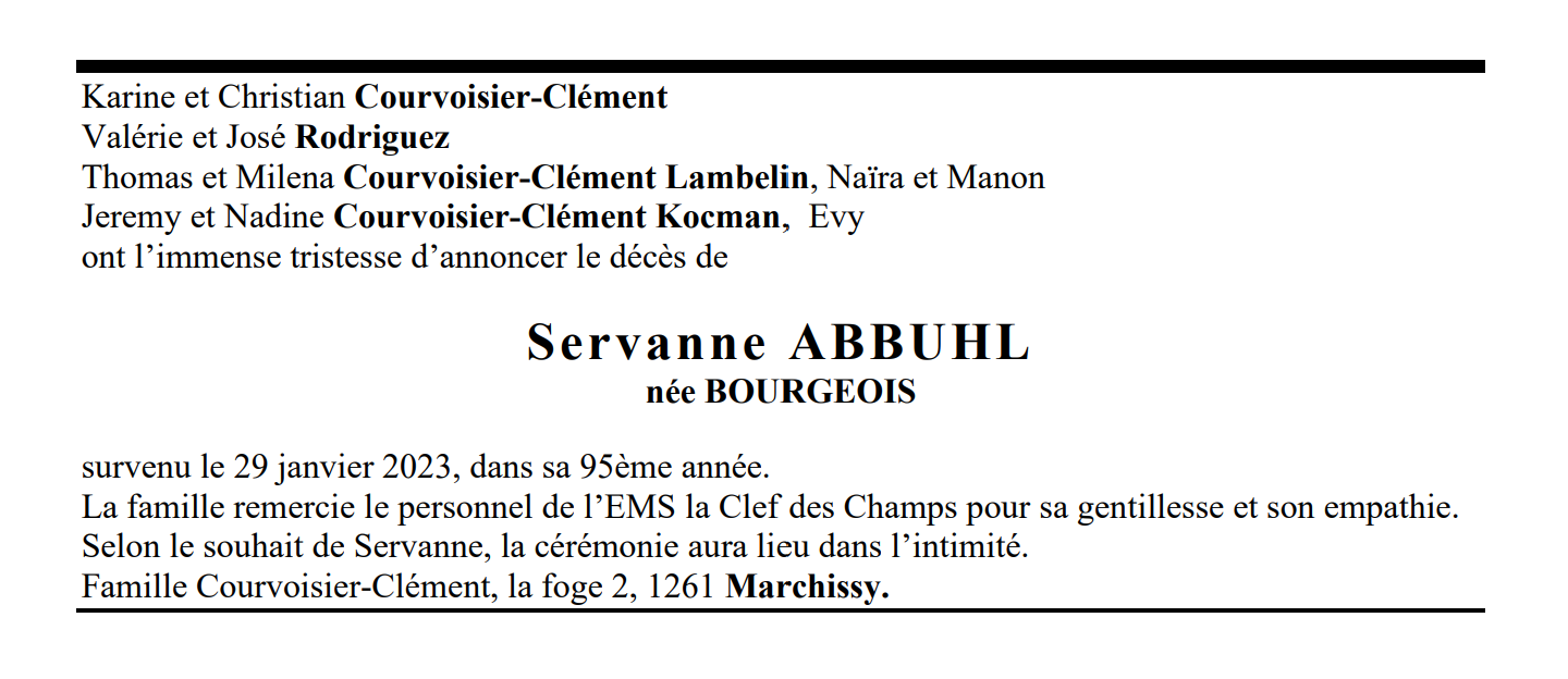 Servanne ABBUHL 03 jan. 1929 - 29 jan. 2023 Avis mortuaire PFG Télecharger PDF Partager sur: Galerie PreviousNext PreviousNext