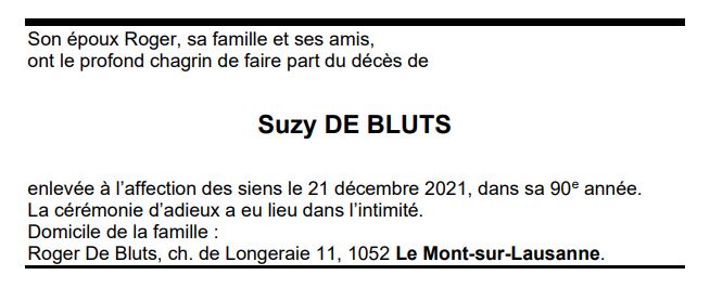 Suzy DE BLUTS 09 aoû. 1932 - 21 déc. 2021 Avis mortuaire PFG Télecharger PDF Partager sur: Galerie PreviousNext PreviousNext