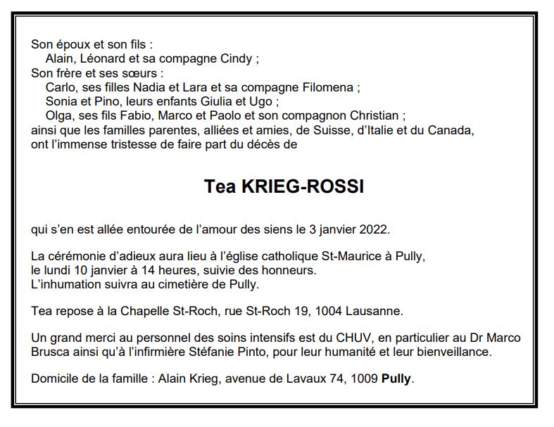 Tea KRIEG-ROSSI 26 juil. 1953 - 03 jan. 2022 Avis mortuaire PFG Télecharger PDF Partager sur: Galerie PreviousNext PreviousNext