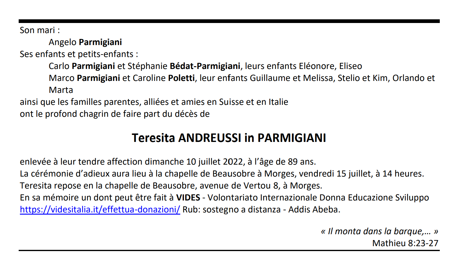 Teresita ANDREUSSI in PARMIGIANI 13 jan. 1933 - 10 juil. 2022 Avis mortuaire PFG Télecharger PDF Partager sur: Galerie PreviousNext PreviousNext