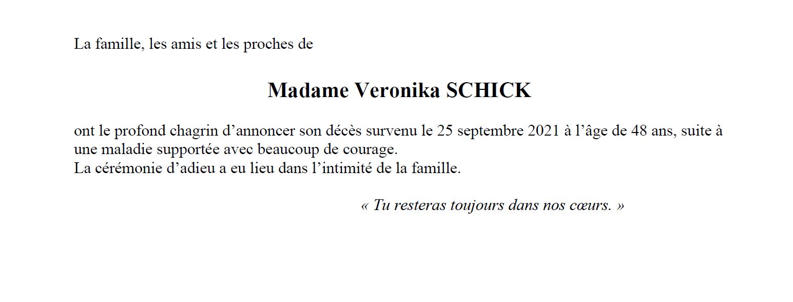 Veronika SCHICK 12 sep. 1973 - 25 sep. 2021 Avis mortuaire PFG Télecharger PDF Partager sur: Galerie PreviousNext PreviousNext