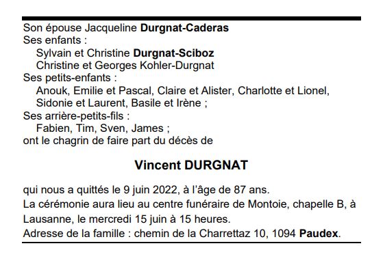 Vincent DURGNAT 04 fév. 1935 - 09 juin. 2022 Avis mortuaire PFG Télecharger PDF Partager sur: Galerie PreviousNext PreviousNext