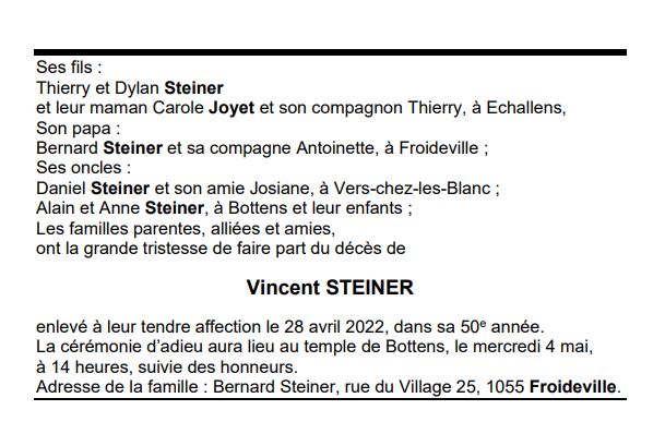 Vincent STEINER 18 déc. 1972 - 28 avr. 2022 Avis mortuaire PFG Télecharger PDF Partager sur: Galerie PreviousNext PreviousNext