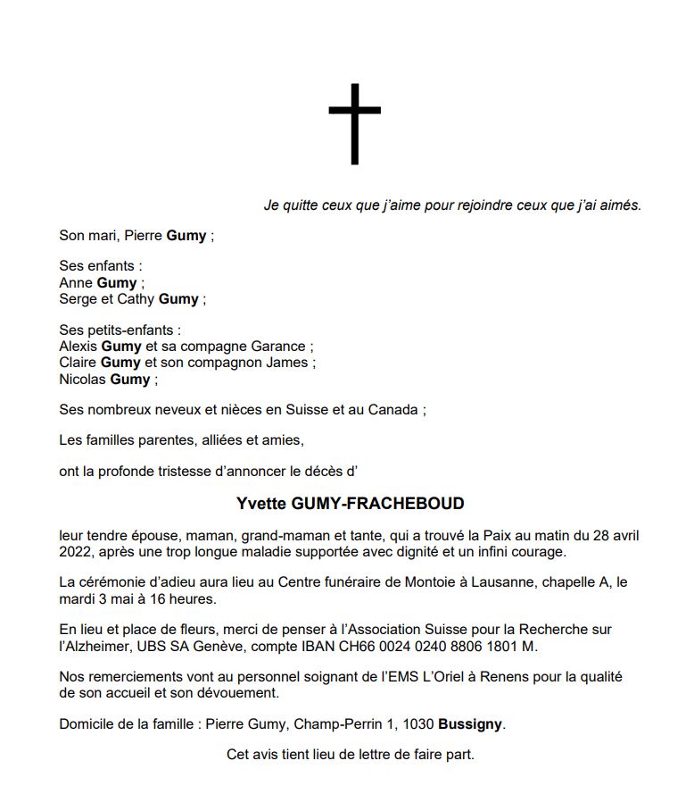 Yvette GUMY-FRACHEBOUD 30 oct. 1934 - 28 avr. 2022 Avis mortuaire PFG Télecharger PDF Partager sur: Galerie PreviousNext PreviousNext