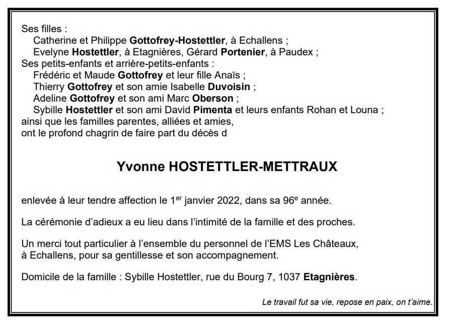 Yvonne HOSTETTLER-METTRAUX 21 aoû. 1926 - 01 jan. 2022 Avis mortuaire PFG Télecharger PDF Partager sur: Galerie PreviousNext PreviousNext