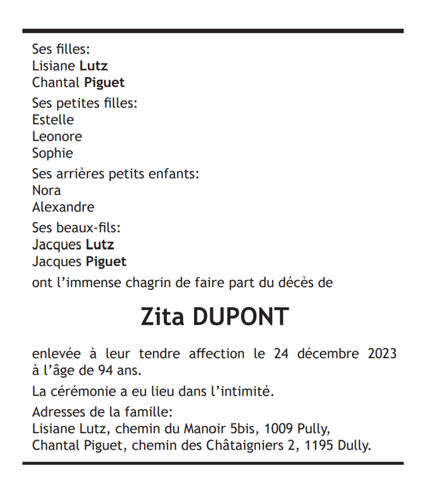 Zita Dupont 24 juin. 1926 - 24 déc. 2023 Avis mortuaire PFG Télecharger PDF Partager sur: Galerie PreviousNext PreviousNext