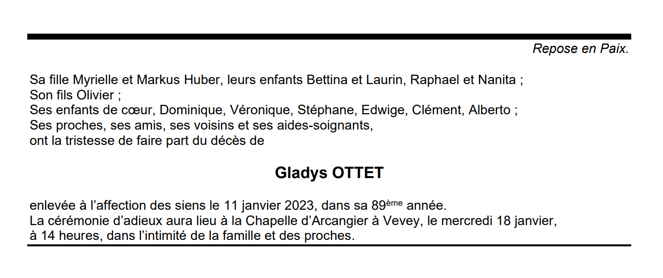 Gladys OTTET 02 sep. 1934 - 11 jan. 2023 Avis mortuaire PFG Télecharger PDF Partager sur: Galerie PreviousNext PreviousNext