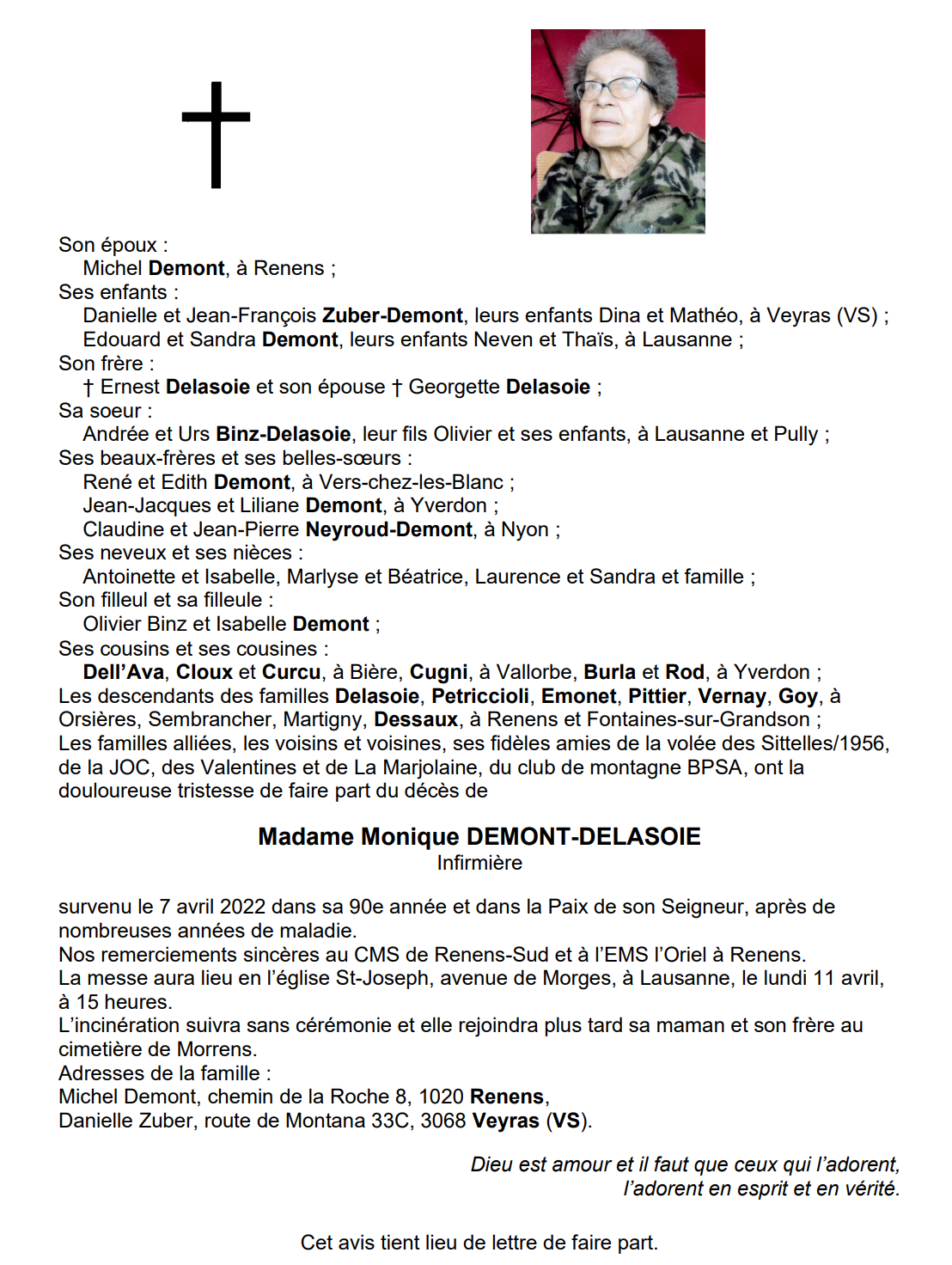 Madame Monique DEMONT-DELASOIE 11 jan. 1933 - 07 avr. 2022 Avis mortuaire PFG Télecharger PDF Partager sur: Galerie PreviousNext PreviousNext