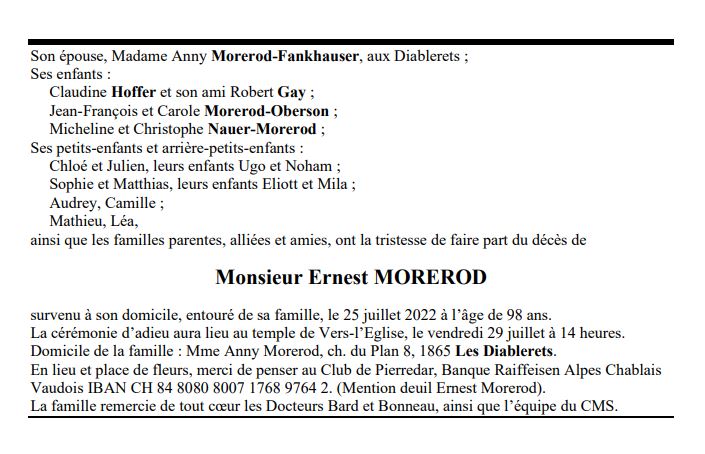 Monsieur Ernest MOREROD 17 aoû. 1924 - 25 juil. 2022 Avis mortuaire PFG Télecharger PDF Partager sur: Galerie PreviousNext PreviousNext