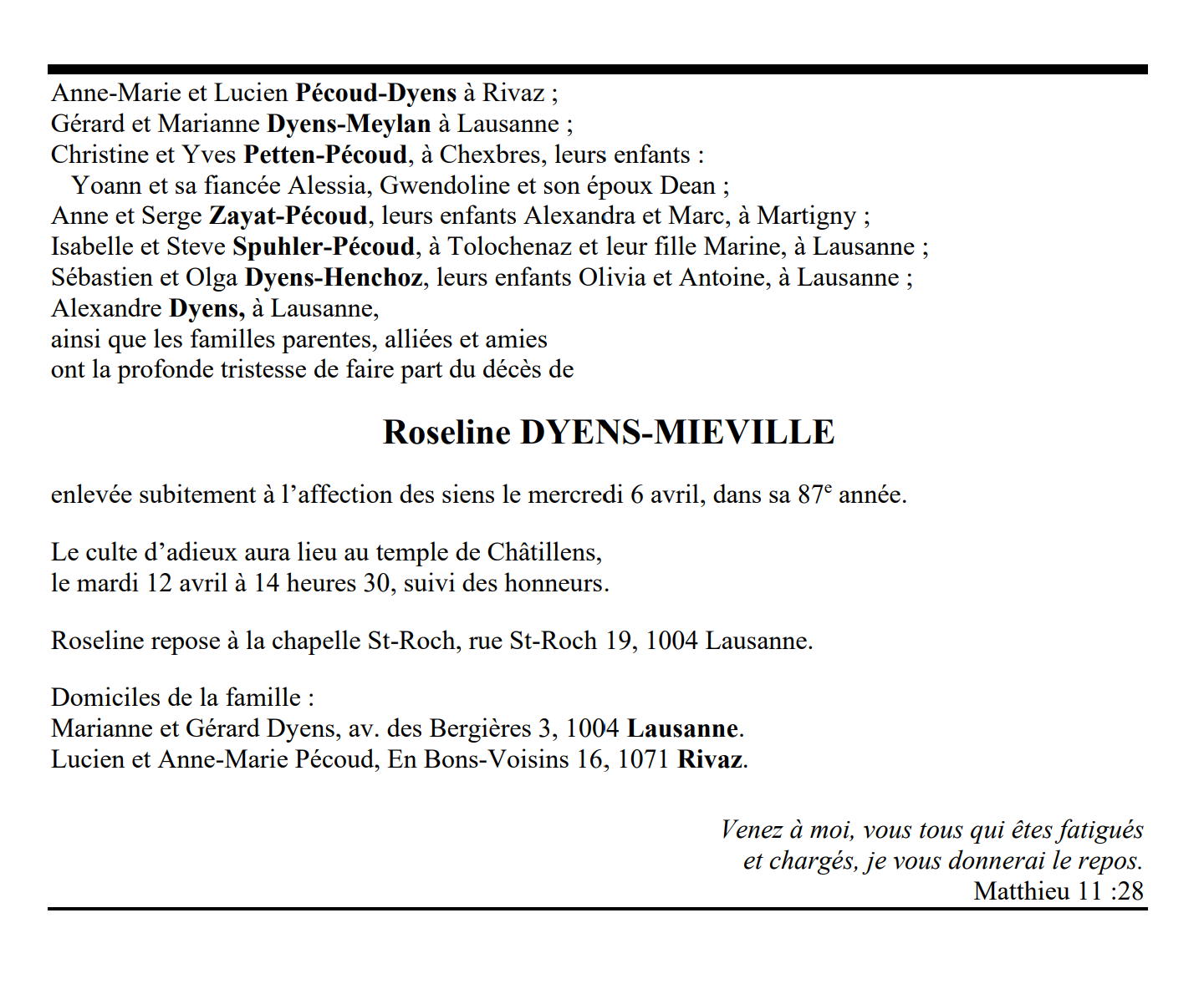 Roseline DYENS-MIEVILLE 26 sep. 1935 - 06 avr. 2022 Avis mortuaire PFG Télecharger PDF Partager sur: Galerie PreviousNext PreviousNext